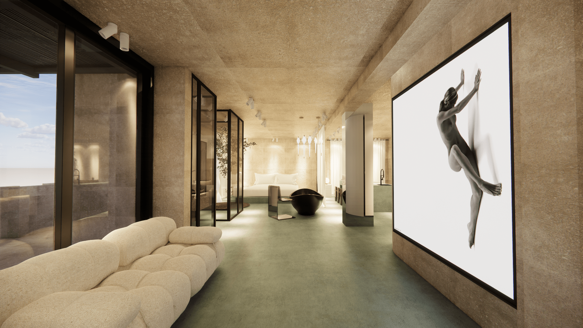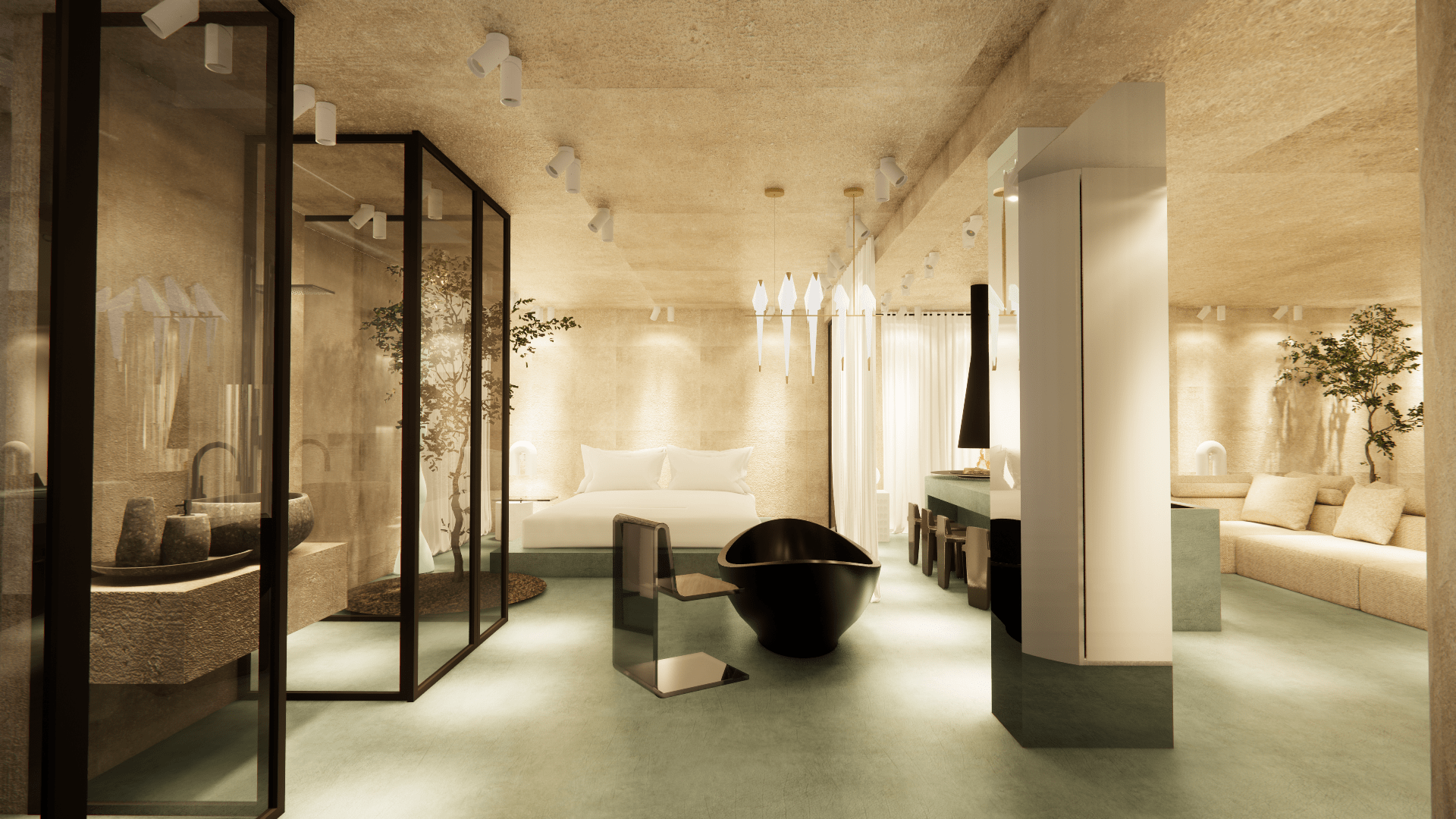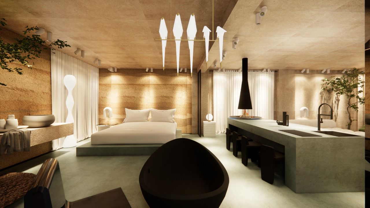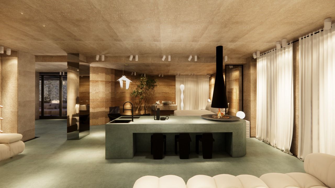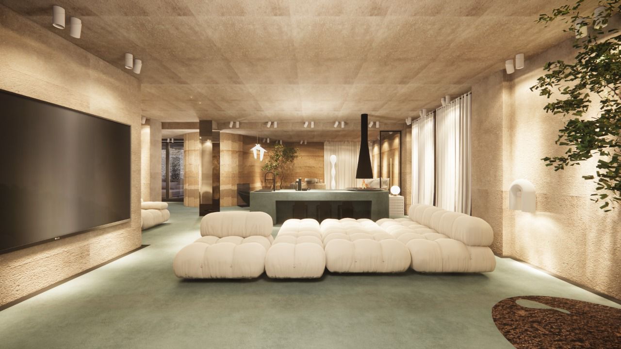 Micro-cement floors in soft green and beige, paired with muted walls and ceiling, create a serene atmosphere. The space features minimalist furniture and accessories, enhancing the sense of calm and comfort. The use of white tones and soft textures promotes a relaxing, uncluttered environment, while natural light flows freely, emphasizing the spaciousness.