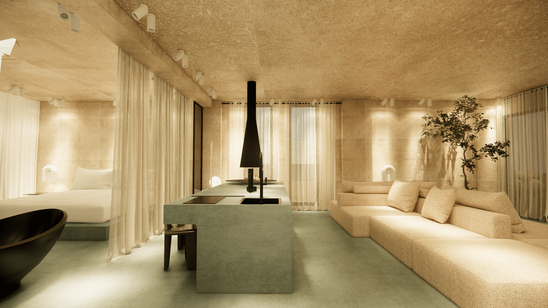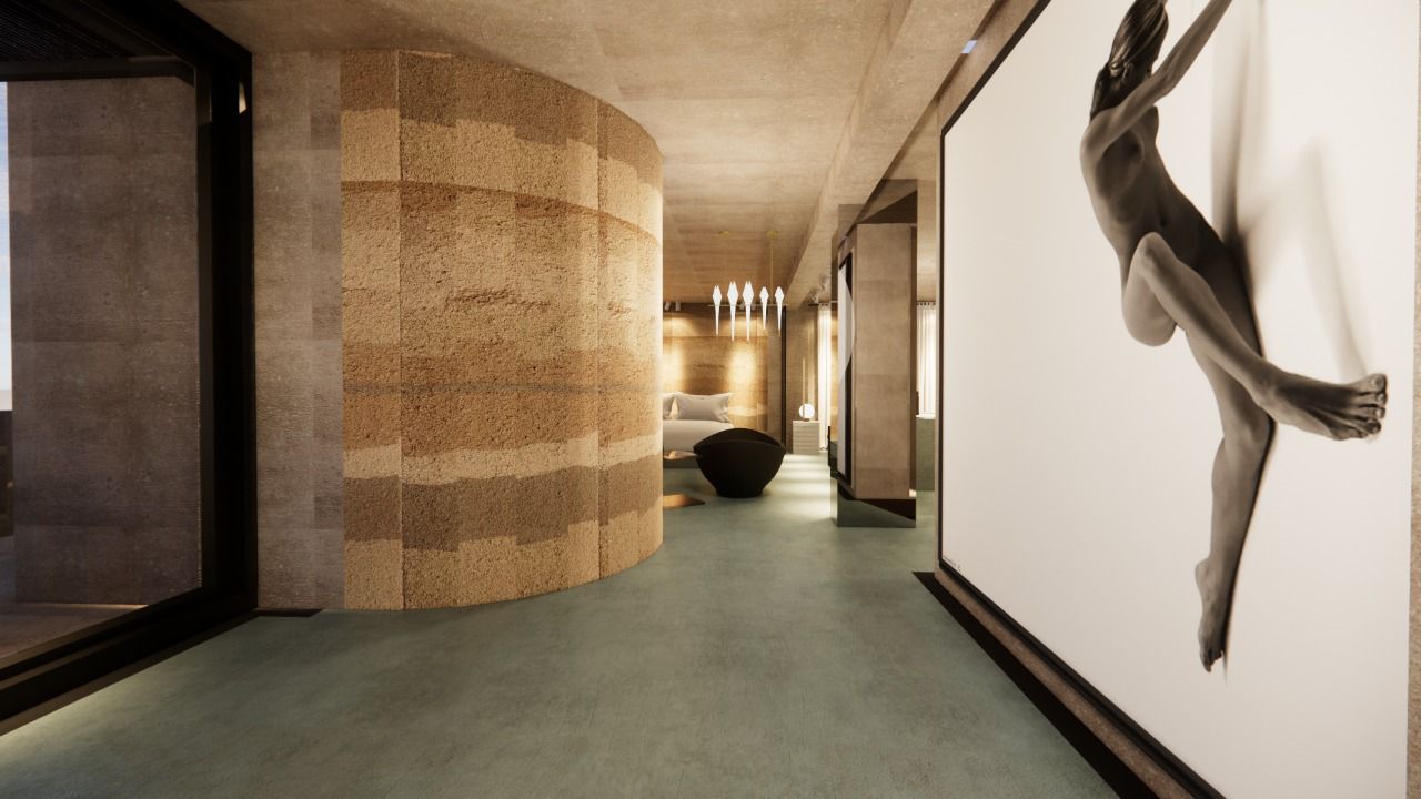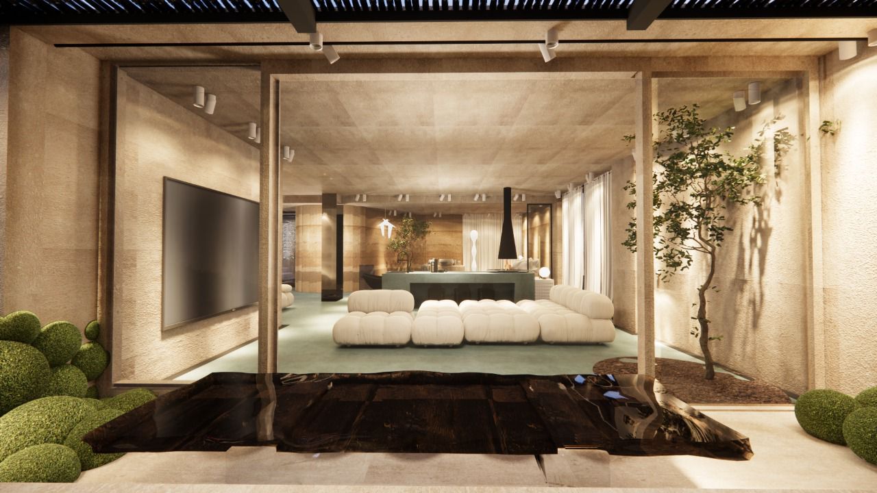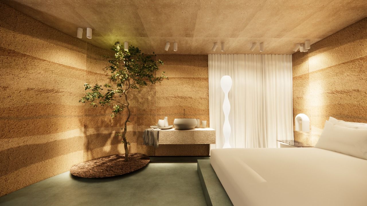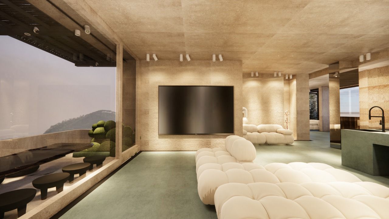 Micro-cement floors in soft green and beige, paired with muted walls and ceiling, create a serene atmosphere. The space features minimalist furniture and accessories, enhancing the sense of calm and comfort. The use of white tones and soft textures promotes a relaxing, uncluttered environment, while natural light flows freely, emphasizing the spaciousness.