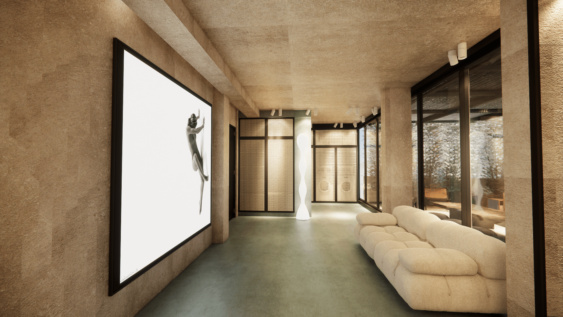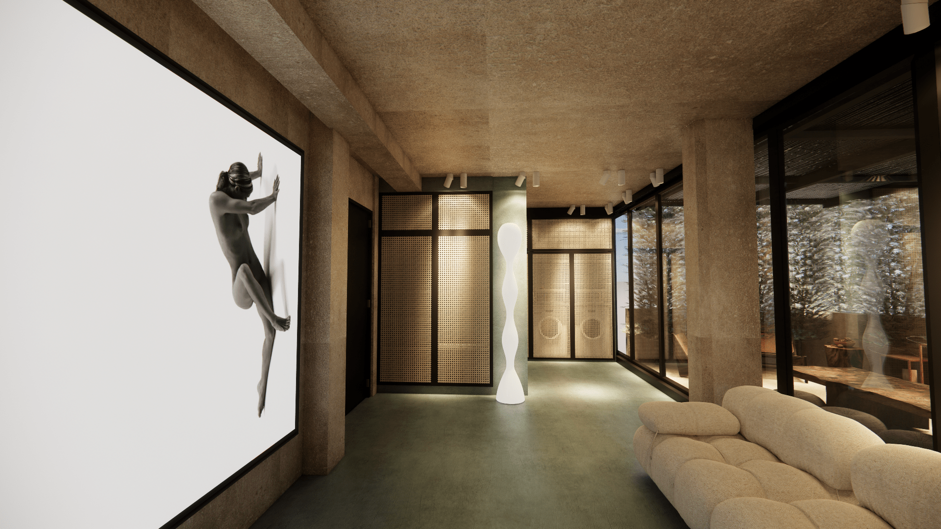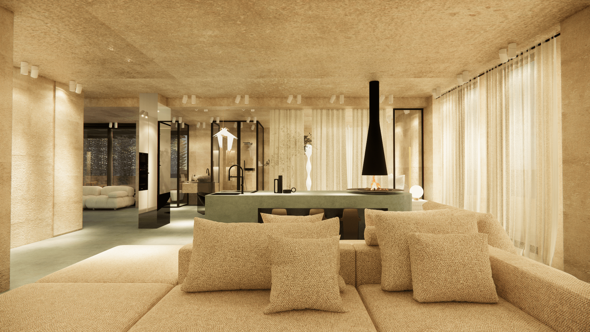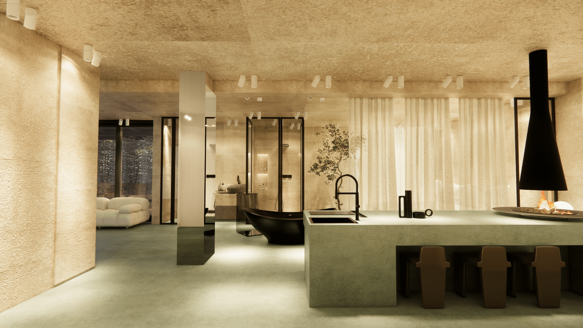 Micro-cement floors in soft green and beige, paired with muted walls and ceiling, create a serene atmosphere. The space features minimalist furniture and accessories, enhancing the sense of calm and comfort. The use of white tones and soft textures promotes a relaxing, uncluttered environment, while natural light flows freely, emphasizing the spaciousness.